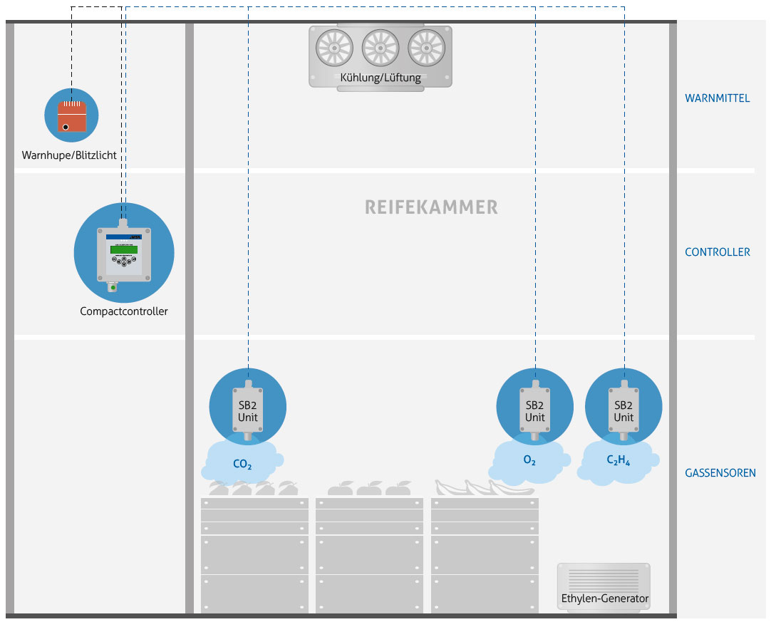 Frisches Obst und Gemüse ist lebendig und atmet auch nach der Ernte weiter. Dies führt zu Sauerstoffverbrauch und zur Entstehung von Kohlendioxid- und Wasserdampf. Die Produkte frisch zu halten, bedeutet, den Prozess zu verlangsamen und gleichzeitig die Qualität des Produkts zu erhalten. Neben der modernen Technologie der Reifekammern, sind Gassensoren zur permanenten Überwachung der am Reifeprozess beteiligten, verschiedenen Gaskonzentrationen erforderlich. Die Sensoren, Controller und Warnmittel von MSR-Electronic schützen Menschen und Anlagen wirkungsvoll und überwachen das System als einen zentralen Punkt des gesamten Prozesses. Mithilfe der modernen Kommunikationstechnologie kann schnell reagiert werden.