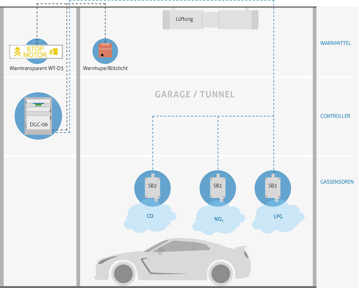Stationäre Gaswarnanlagen in Garagen, Tunnel und Ladezonen sind das entscheidende Überwachungsinstrument eines Lüftungssystems. Es regelt die Luftqualität in geschlossenen Räumlichkeiten und entscheidet darüber, wann die Lüftung anlaufen muss.