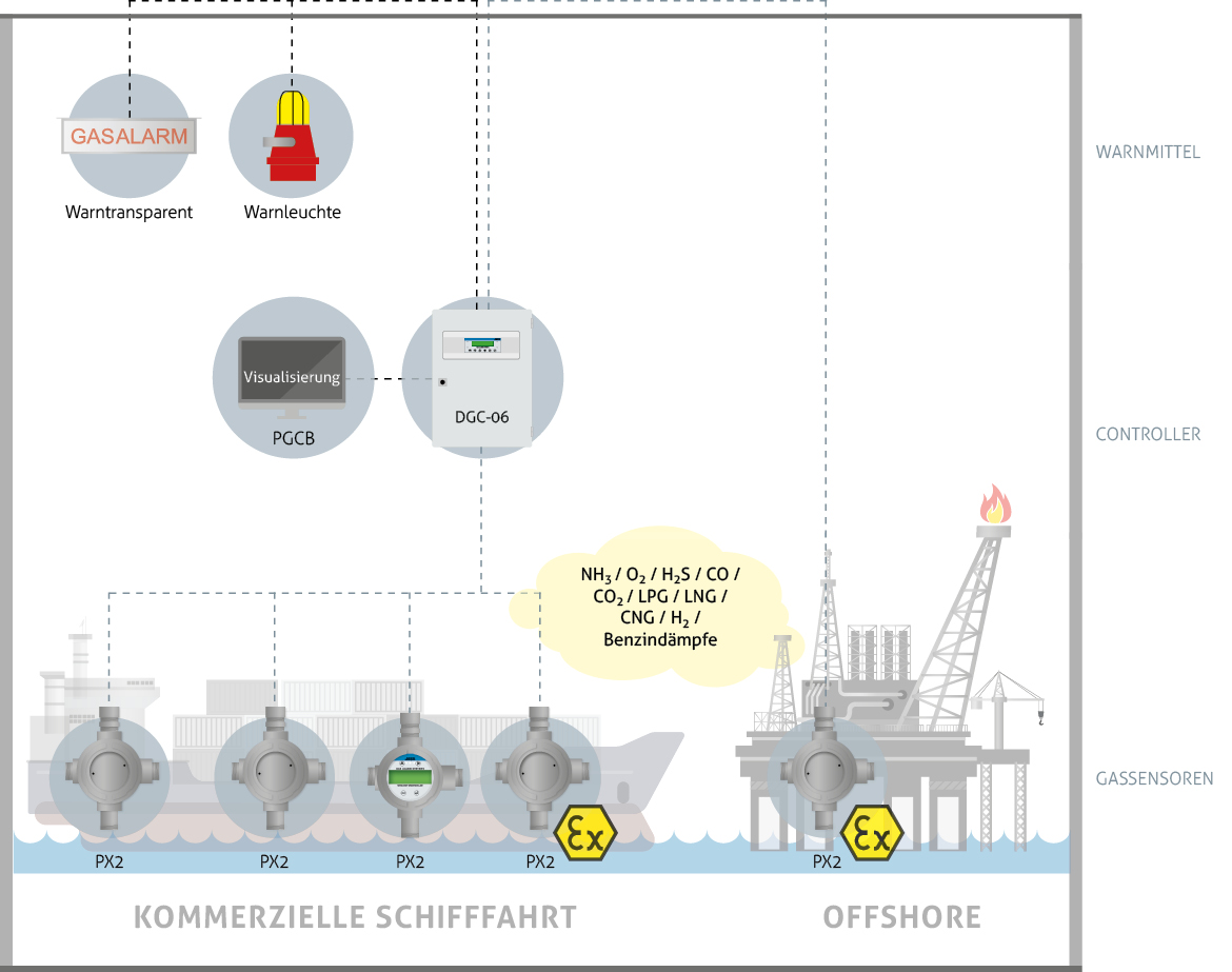 Schiffe und Bohrinseln sind Risiko-Bereiche, da keine Möglichkeit zur Flucht besteht. Es können sich jederzeit gefährliche Gaskonzentrationen bilden, die frühzeitig erkannt werden müssen.